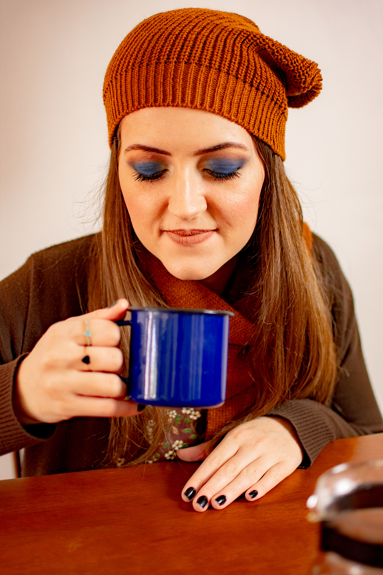 Sempre amei tomar café, mas depois que descobri os cafés especiais, comecei a ter outra visão sobre café (assista o vídeo para saber mais). E, nessa composição de roupa marrom, decidi optar por uma maquiagem azul marinho, ficando uma maquiagem mais elegante e charmosa. Como o marrom é uma sombra mais neutra, o azul marinho vai dar um destaque bonito para a composição. Espero que gostem!